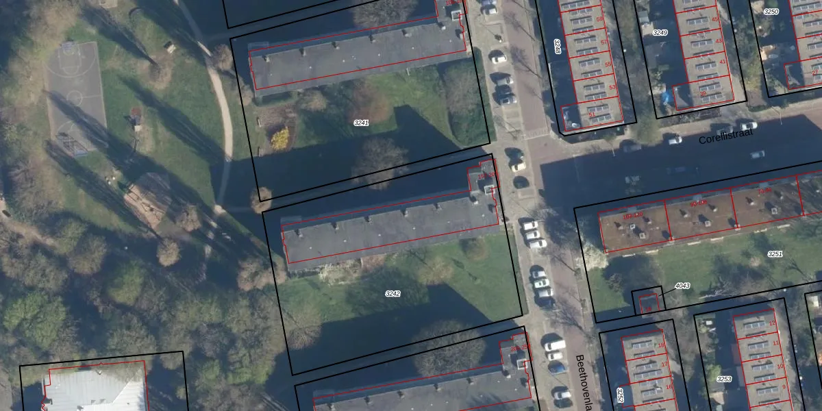 Beethovenlaan 165 is gelegen op kadastraal perceel LDN01O3242. Deze kadastrale aanduiding is uniek en wordt gebruikt door het Kadaster om eigendomsrechten en andere zakelijke rechten vast te leggen. Het perceel maakt onderdeel uit van de kadastrale gemeente Leiden.