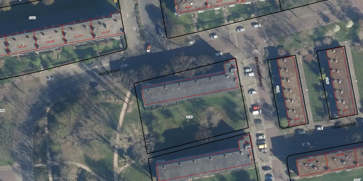 Het perceel waarop Beethovenlaan 23 staat heeft een oppervlakte van 2265 m². Dit is een zeer groot perceel. De perceeloppervlakte wordt geregistreerd door het Kadaster. Gedetailleerde informatie over de maten van dit perceel kunt u vinden in het rapport Kadastrale kaart met maatvoering van Beethovenlaan 23.