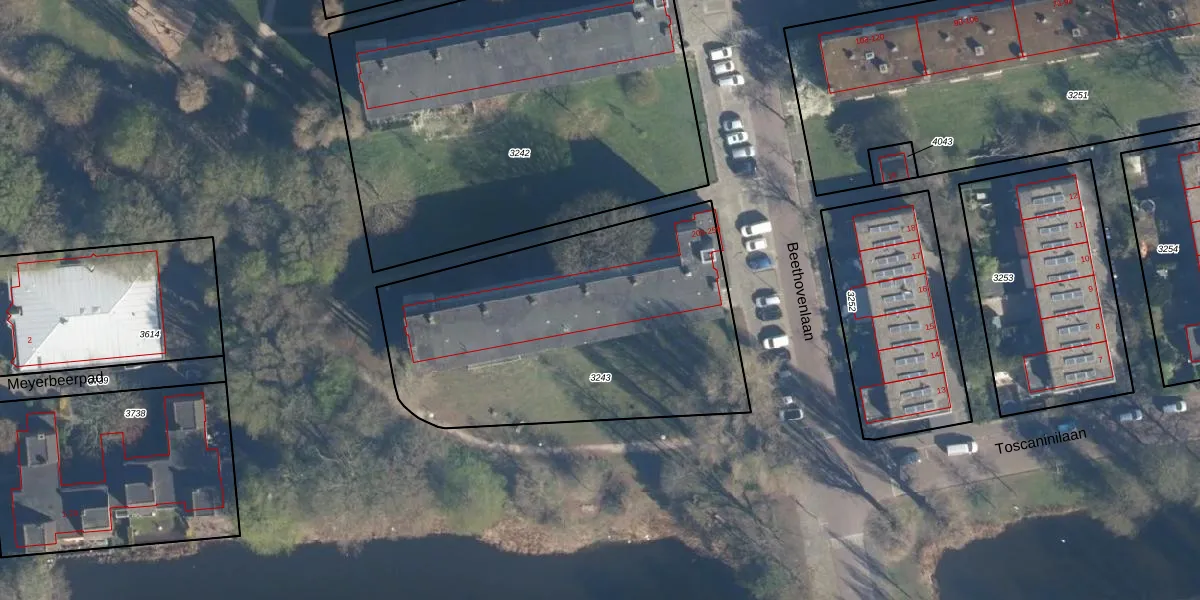 Beethovenlaan 241 is gelegen op kadastraal perceel LDN01O3243. Deze kadastrale aanduiding is uniek en wordt gebruikt door het Kadaster om eigendomsrechten en andere zakelijke rechten vast te leggen. Het perceel maakt onderdeel uit van de kadastrale gemeente Leiden.