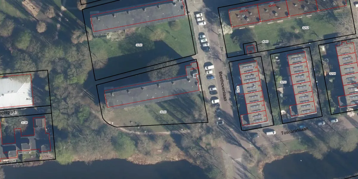 Beethovenlaan 251 is gelegen op kadastraal perceel LDN01O3243. Deze kadastrale aanduiding is uniek en wordt gebruikt door het Kadaster om eigendomsrechten en andere zakelijke rechten vast te leggen. Het perceel maakt onderdeel uit van de kadastrale gemeente Leiden.