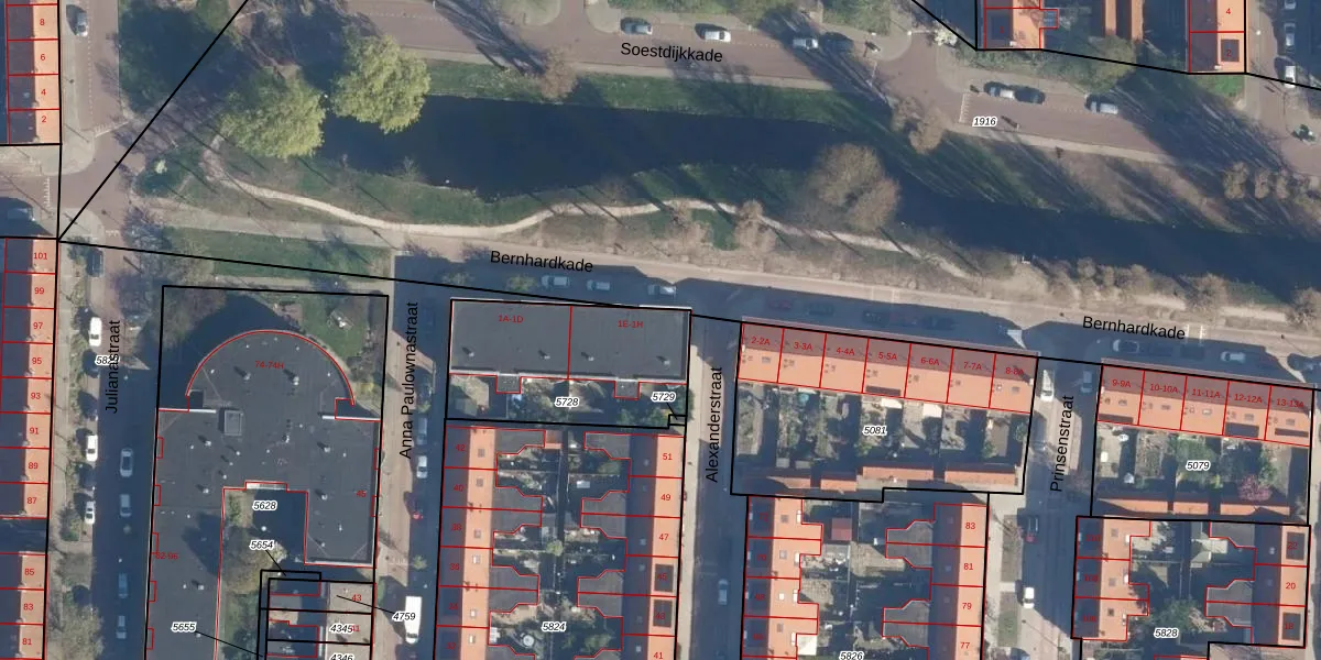 Het perceel waarop Bernhardkade 1-G staat heeft een oppervlakte van 650 m². Dit is een groot perceel. De perceeloppervlakte wordt geregistreerd door het Kadaster. Gedetailleerde informatie over de maten van dit perceel kunt u vinden in het rapport Kadastrale kaart met maatvoering van Bernhardkade 1-G.