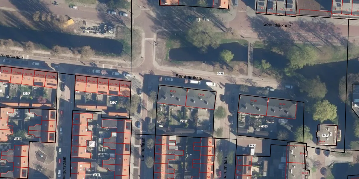 Het perceel waarop Bernhardkade 21 staat heeft een oppervlakte van 835 m². Dit is een groot perceel. De perceeloppervlakte wordt geregistreerd door het Kadaster. Gedetailleerde informatie over de maten van dit perceel kunt u vinden in het rapport Kadastrale kaart met maatvoering van Bernhardkade 21.