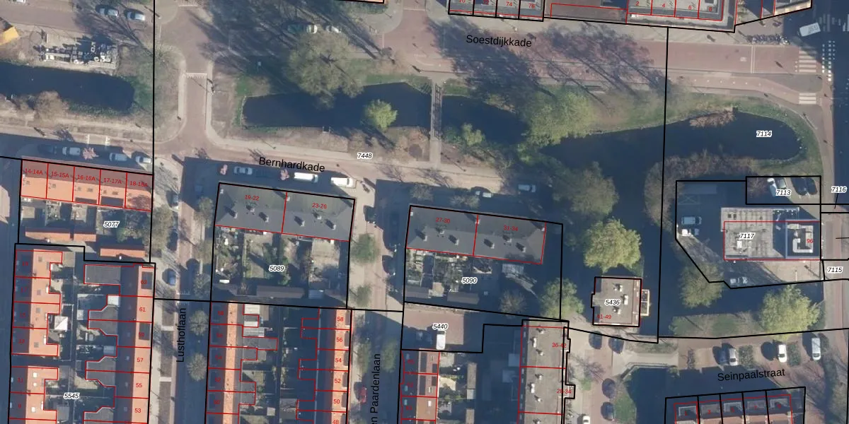 Het perceel waarop Bernhardkade 27 staat heeft een oppervlakte van 845 m². Dit is een groot perceel. De perceeloppervlakte wordt geregistreerd door het Kadaster. Gedetailleerde informatie over de maten van dit perceel kunt u vinden in het rapport Kadastrale kaart met maatvoering van Bernhardkade 27.