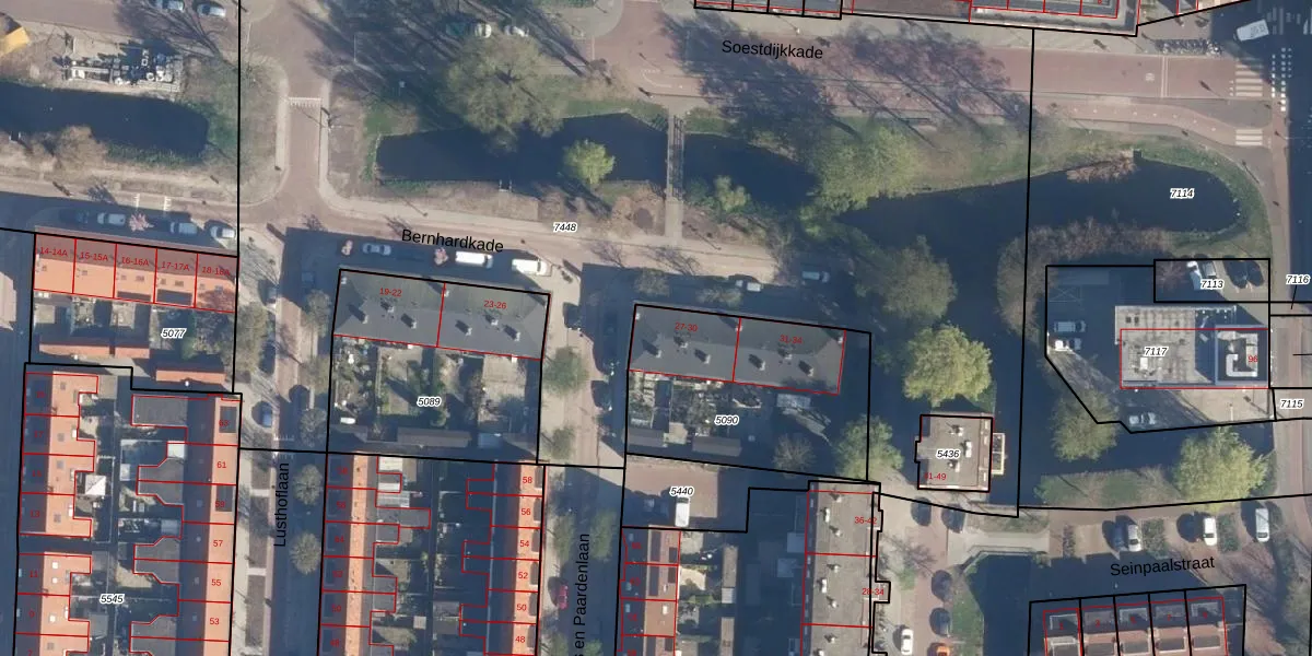 Het perceel waarop Bernhardkade 28 staat heeft een oppervlakte van 845 m². Dit is een groot perceel. De perceeloppervlakte wordt geregistreerd door het Kadaster. Gedetailleerde informatie over de maten van dit perceel kunt u vinden in het rapport Kadastrale kaart met maatvoering van Bernhardkade 28.