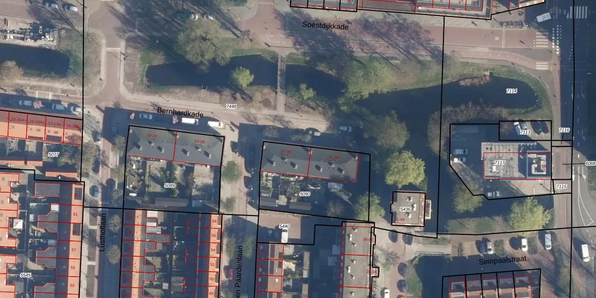 Het perceel waarop Bernhardkade 29 staat heeft een oppervlakte van 845 m². Dit is een groot perceel. De perceeloppervlakte wordt geregistreerd door het Kadaster. Gedetailleerde informatie over de maten van dit perceel kunt u vinden in het rapport Kadastrale kaart met maatvoering van Bernhardkade 29.