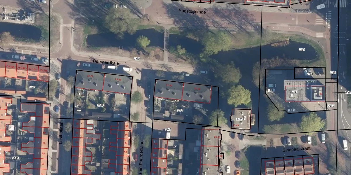 Het perceel waarop Bernhardkade 30 staat heeft een oppervlakte van 845 m². Dit is een groot perceel. De perceeloppervlakte wordt geregistreerd door het Kadaster. Gedetailleerde informatie over de maten van dit perceel kunt u vinden in het rapport Kadastrale kaart met maatvoering van Bernhardkade 30.