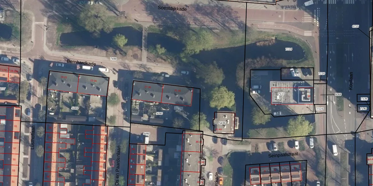 Het perceel waarop Bernhardkade 34 staat heeft een oppervlakte van 845 m². Dit is een groot perceel. De perceeloppervlakte wordt geregistreerd door het Kadaster. Gedetailleerde informatie over de maten van dit perceel kunt u vinden in het rapport Kadastrale kaart met maatvoering van Bernhardkade 34.