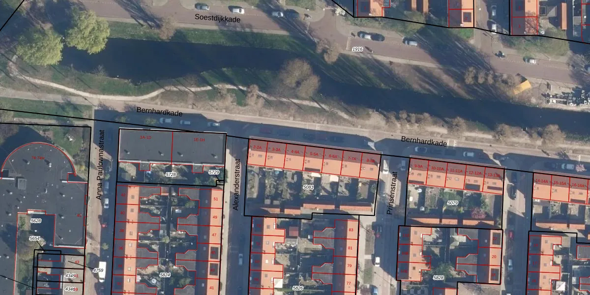 Het perceel waarop Bernhardkade 4 staat heeft een oppervlakte van 1042 m². Dit is een zeer groot perceel. De perceeloppervlakte wordt geregistreerd door het Kadaster. Gedetailleerde informatie over de maten van dit perceel kunt u vinden in het rapport Kadastrale kaart met maatvoering van Bernhardkade 4.