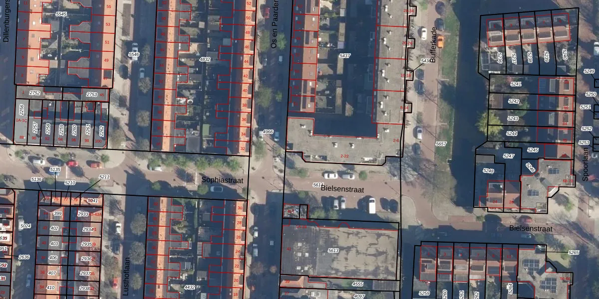 Het perceel waarop Bielsenstraat 2 staat heeft een oppervlakte van 2435 m². Dit is een zeer groot perceel. De perceeloppervlakte wordt geregistreerd door het Kadaster. Gedetailleerde informatie over de maten van dit perceel kunt u vinden in het rapport Kadastrale kaart met maatvoering van Bielsenstraat 2.