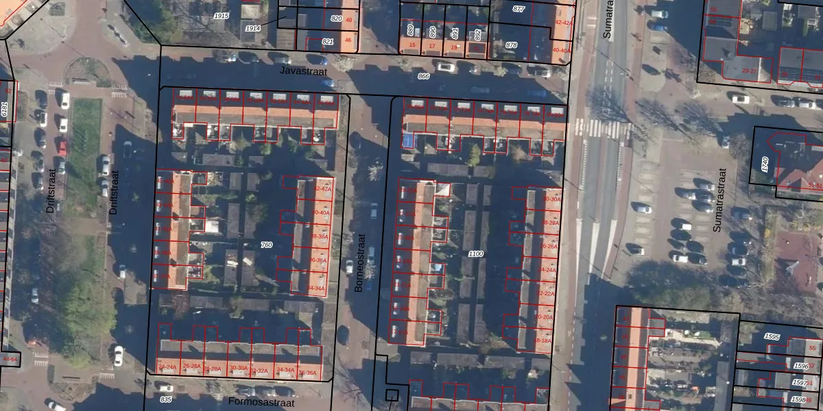Het perceel waarop Borneostraat 27-A staat heeft een oppervlakte van 3404 m². Dit is een zeer groot perceel. De perceeloppervlakte wordt geregistreerd door het Kadaster. Gedetailleerde informatie over de maten van dit perceel kunt u vinden in het rapport Kadastrale kaart met maatvoering van Borneostraat 27-A.