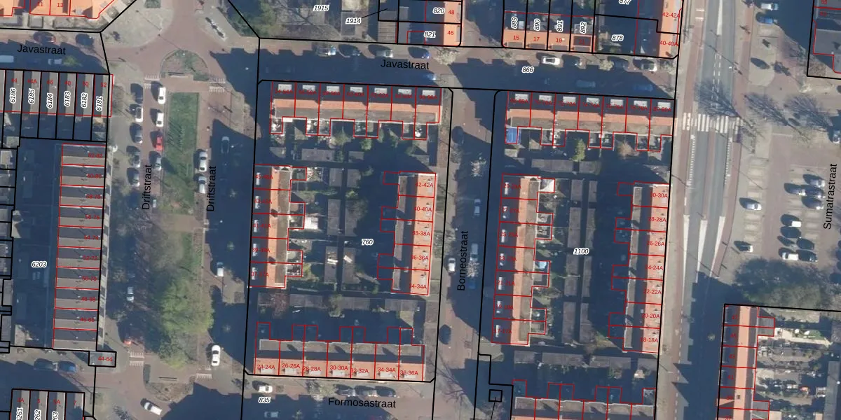 Het perceel waarop Borneostraat 40-A staat heeft een oppervlakte van 3200 m². Dit is een zeer groot perceel. De perceeloppervlakte wordt geregistreerd door het Kadaster. Gedetailleerde informatie over de maten van dit perceel kunt u vinden in het rapport Kadastrale kaart met maatvoering van Borneostraat 40-A.