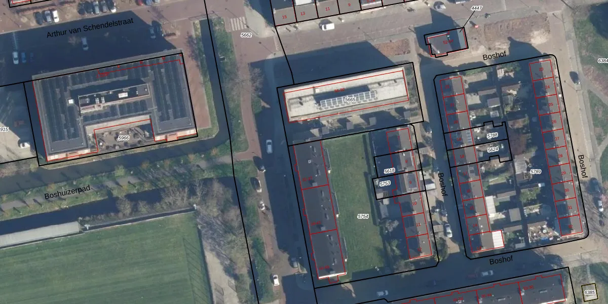 Boshuizerkade 33 is gelegen op kadastraal perceel LDN01O5754. Deze kadastrale aanduiding is uniek en wordt gebruikt door het Kadaster om eigendomsrechten en andere zakelijke rechten vast te leggen. Het perceel maakt onderdeel uit van de kadastrale gemeente Leiden.