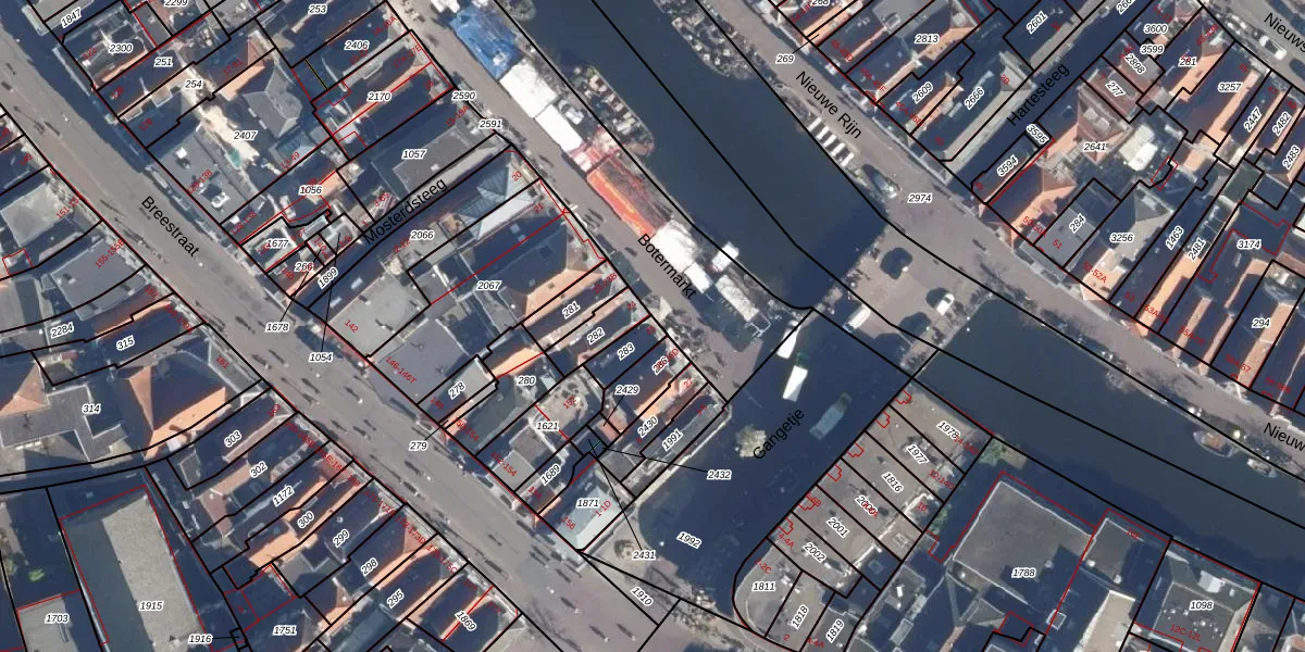 Het perceel waarop Botermarkt 25 staat heeft een oppervlakte van 63 m². Dit is een klein perceel. De perceeloppervlakte wordt geregistreerd door het Kadaster. Gedetailleerde informatie over de maten van dit perceel kunt u vinden in het rapport Kadastrale kaart met maatvoering van Botermarkt 25.