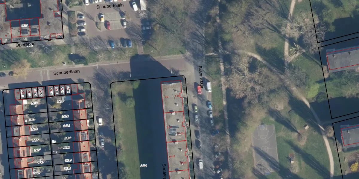 Het perceel waarop Brahmslaan 1 staat heeft een oppervlakte van 5611 m². Dit is een zeer groot perceel. De perceeloppervlakte wordt geregistreerd door het Kadaster. Gedetailleerde informatie over de maten van dit perceel kunt u vinden in het rapport Kadastrale kaart met maatvoering van Brahmslaan 1.