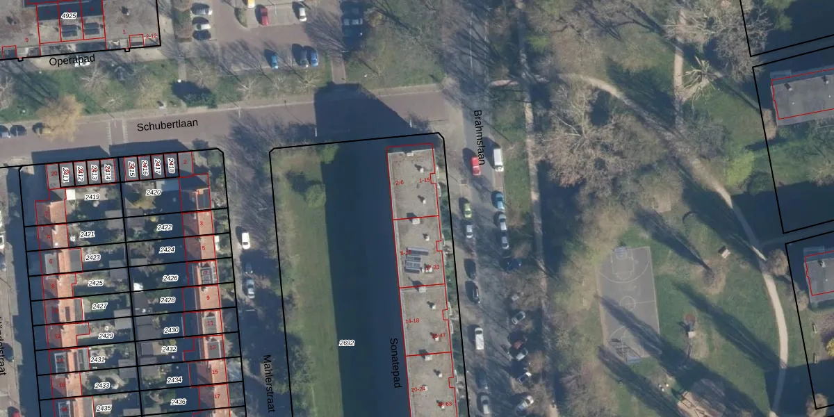 Het perceel waarop Brahmslaan 13 staat heeft een oppervlakte van 5611 m². Dit is een zeer groot perceel. De perceeloppervlakte wordt geregistreerd door het Kadaster. Gedetailleerde informatie over de maten van dit perceel kunt u vinden in het rapport Kadastrale kaart met maatvoering van Brahmslaan 13.