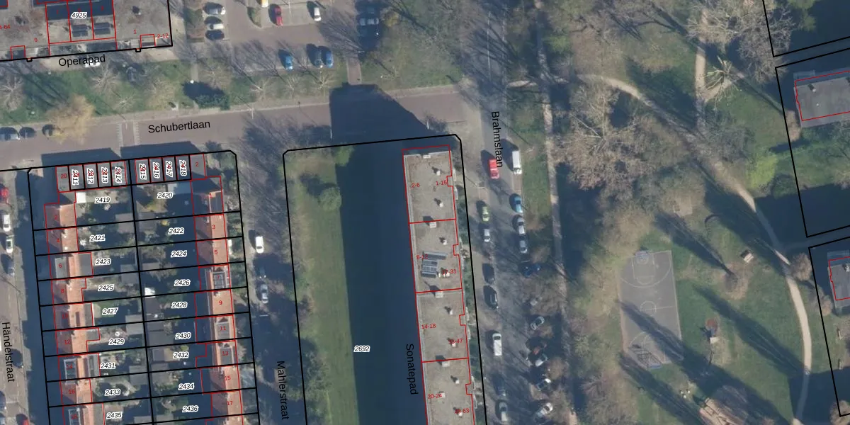 Het perceel waarop Brahmslaan 15 staat heeft een oppervlakte van 5611 m². Dit is een zeer groot perceel. De perceeloppervlakte wordt geregistreerd door het Kadaster. Gedetailleerde informatie over de maten van dit perceel kunt u vinden in het rapport Kadastrale kaart met maatvoering van Brahmslaan 15.