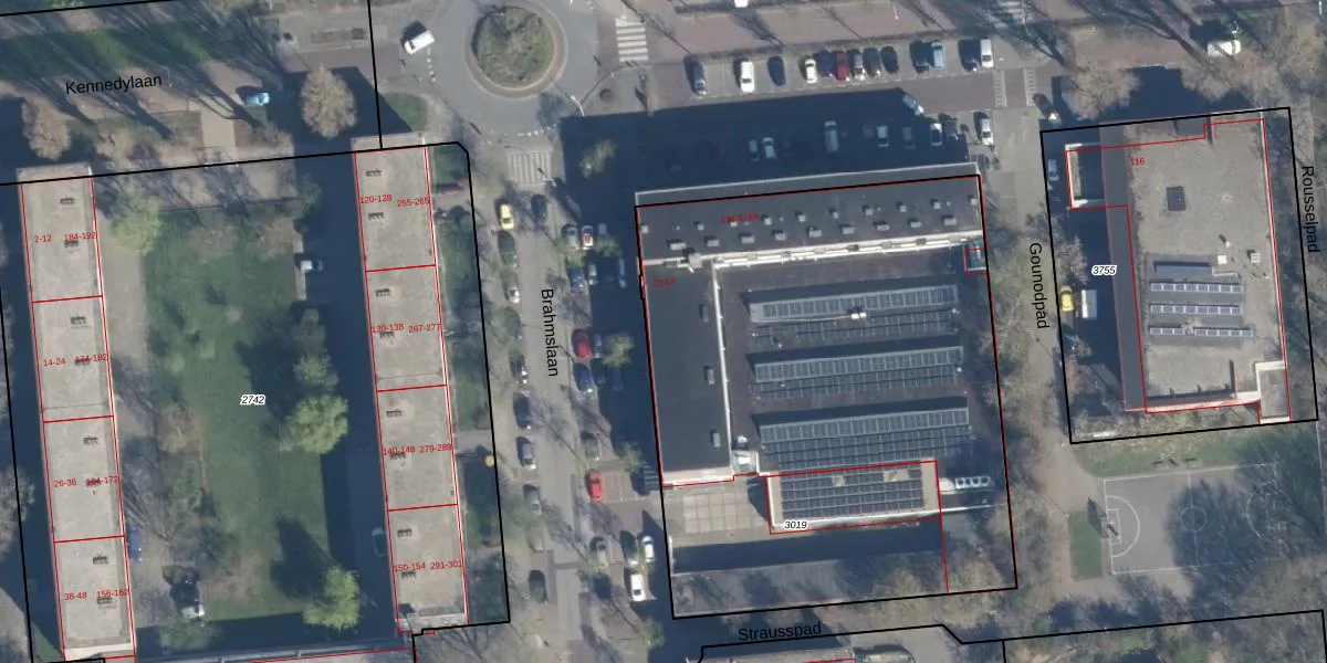 Het perceel waarop Brahmslaan 64 staat heeft een oppervlakte van 3250 m². Dit is een zeer groot perceel. De perceeloppervlakte wordt geregistreerd door het Kadaster. Gedetailleerde informatie over de maten van dit perceel kunt u vinden in het rapport Kadastrale kaart met maatvoering van Brahmslaan 64.