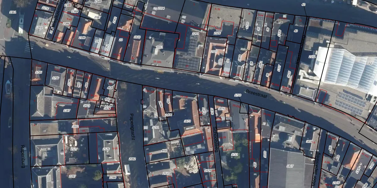 Het perceel waarop Breestraat 19-E staat heeft een oppervlakte van 511 m². Dit is een groot perceel. De perceeloppervlakte wordt geregistreerd door het Kadaster. Gedetailleerde informatie over de maten van dit perceel kunt u vinden in het rapport Kadastrale kaart met maatvoering van Breestraat 19-E.