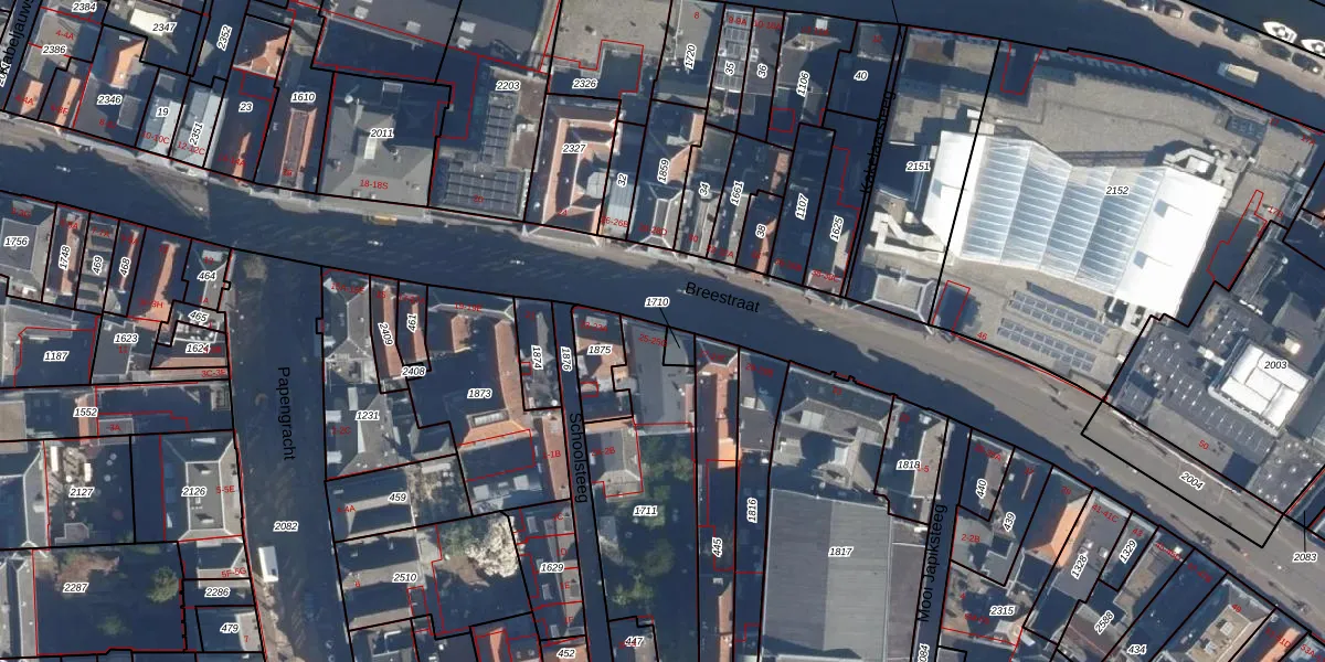 Het perceel waarop Breestraat 25-A staat heeft een oppervlakte van 652 m². Dit is een groot perceel. De perceeloppervlakte wordt geregistreerd door het Kadaster. Gedetailleerde informatie over de maten van dit perceel kunt u vinden in het rapport Kadastrale kaart met maatvoering van Breestraat 25-A.