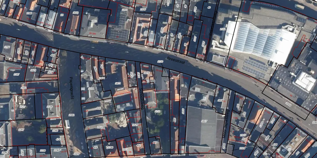 Het perceel waarop Breestraat 25-G staat heeft een oppervlakte van 652 m². Dit is een groot perceel. De perceeloppervlakte wordt geregistreerd door het Kadaster. Gedetailleerde informatie over de maten van dit perceel kunt u vinden in het rapport Kadastrale kaart met maatvoering van Breestraat 25-G.