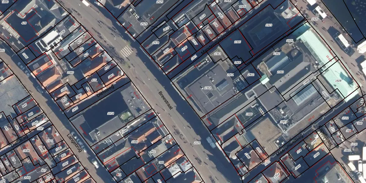 Het perceel waarop Breestraat 78 staat heeft een oppervlakte van 802 m². Dit is een groot perceel. De perceeloppervlakte wordt geregistreerd door het Kadaster. Gedetailleerde informatie over de maten van dit perceel kunt u vinden in het rapport Kadastrale kaart met maatvoering van Breestraat 78.