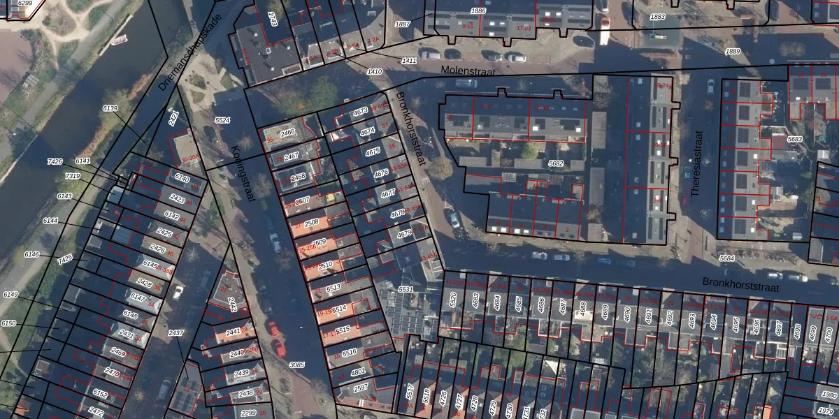 Het perceel waarop Bronkhorststraat 49 staat heeft een oppervlakte van 87 m². Dit is een klein perceel. De perceeloppervlakte wordt geregistreerd door het Kadaster. Gedetailleerde informatie over de maten van dit perceel kunt u vinden in het rapport Kadastrale kaart met maatvoering van Bronkhorststraat 49.