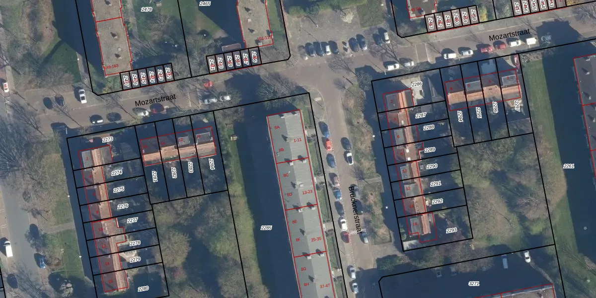 Brucknerstraat 9 is gelegen op kadastraal perceel LDN01O2285. Deze kadastrale aanduiding is uniek en wordt gebruikt door het Kadaster om eigendomsrechten en andere zakelijke rechten vast te leggen. Het perceel maakt onderdeel uit van de kadastrale gemeente Leiden.