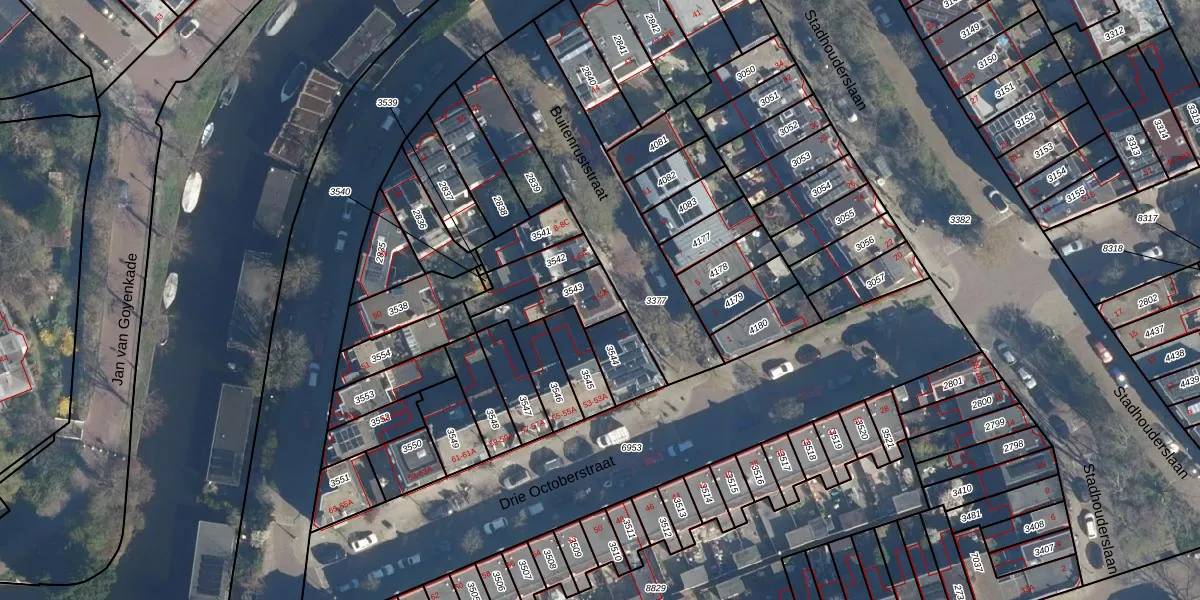 Het adres is gelegen op perceel 3543 in de sectie M en de kadastrale gemeente Leiden. De kadastrale aanduiding is aldus LDN01-M-3543. Het perceel is kleiner dan gemiddeld in Leiden. Het perceel is 134 m² groot, terwijl het gemiddelde ligt op 704,99 m². De grootste perceeloppervlakte in de kadastrale gemeente is 51,8 ha. De kleinste oppervlakte bedraagt 0 m². Op het perceel zijn 2 adressen aanwezig. De huidige grenzen van het perceel zijn digitaal in de Basisregistratie Kadaster (BRK) geregistreerd op 28-08-2003.
