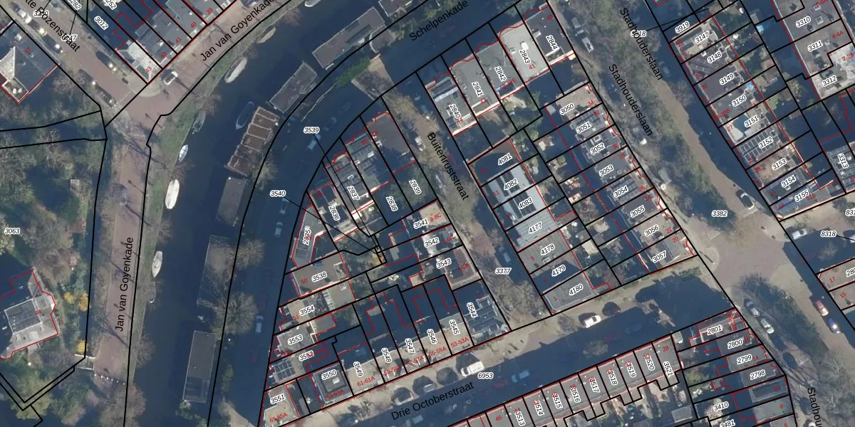 Het adres is gelegen op perceel 3541 in de sectie M en de kadastrale gemeente Leiden. De kadastrale aanduiding is aldus LDN01-M-3541. Het perceel is 98 m² groot. Dat is kleiner dan de gemiddelde perceeloppervlakte in Leiden, dat op 704,97 m² ligt. Het grootste perceel in de kadastrale gemeente is 51,8 ha. Het kleinste perceel heeft een oppervlakte van 0 m². Op het perceel zijn 4 adressen aanwezig. De huidige grenzen van het perceel zijn digitaal in de Basisregistratie Kadaster (BRK) geregistreerd op 28-08-2003.