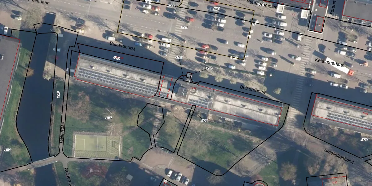 Het perceel waarop Buizerdhorst 56 staat heeft een oppervlakte van 4706 m². Dit is een zeer groot perceel. De perceeloppervlakte wordt geregistreerd door het Kadaster. Gedetailleerde informatie over de maten van dit perceel kunt u vinden in het rapport Kadastrale kaart met maatvoering van Buizerdhorst 56.