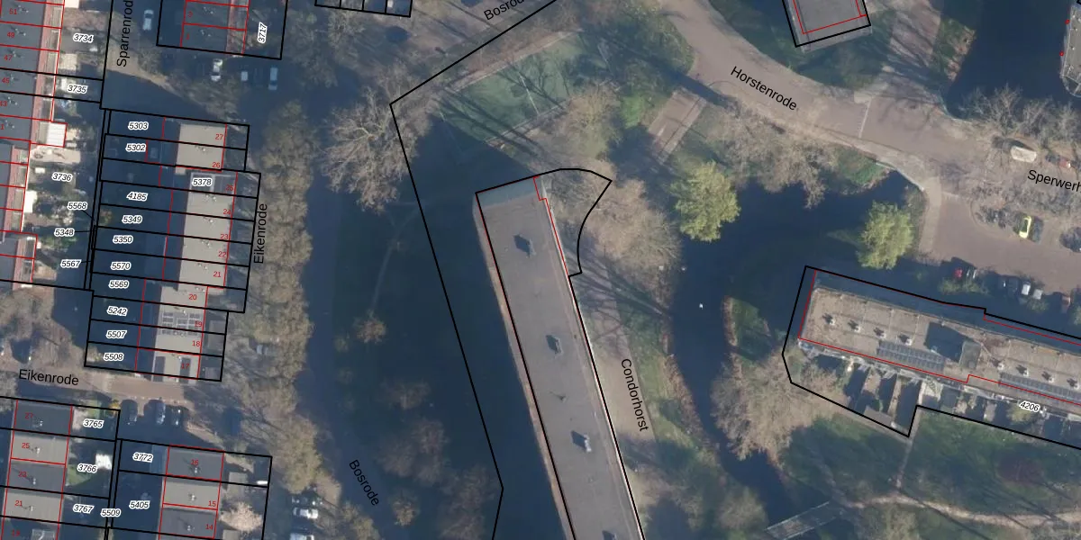 Het perceel waarop Condorhorst 105 staat heeft een oppervlakte van 3278 m². Dit is een zeer groot perceel. De perceeloppervlakte wordt geregistreerd door het Kadaster. Gedetailleerde informatie over de maten van dit perceel kunt u vinden in het rapport Kadastrale kaart met maatvoering van Condorhorst 105.