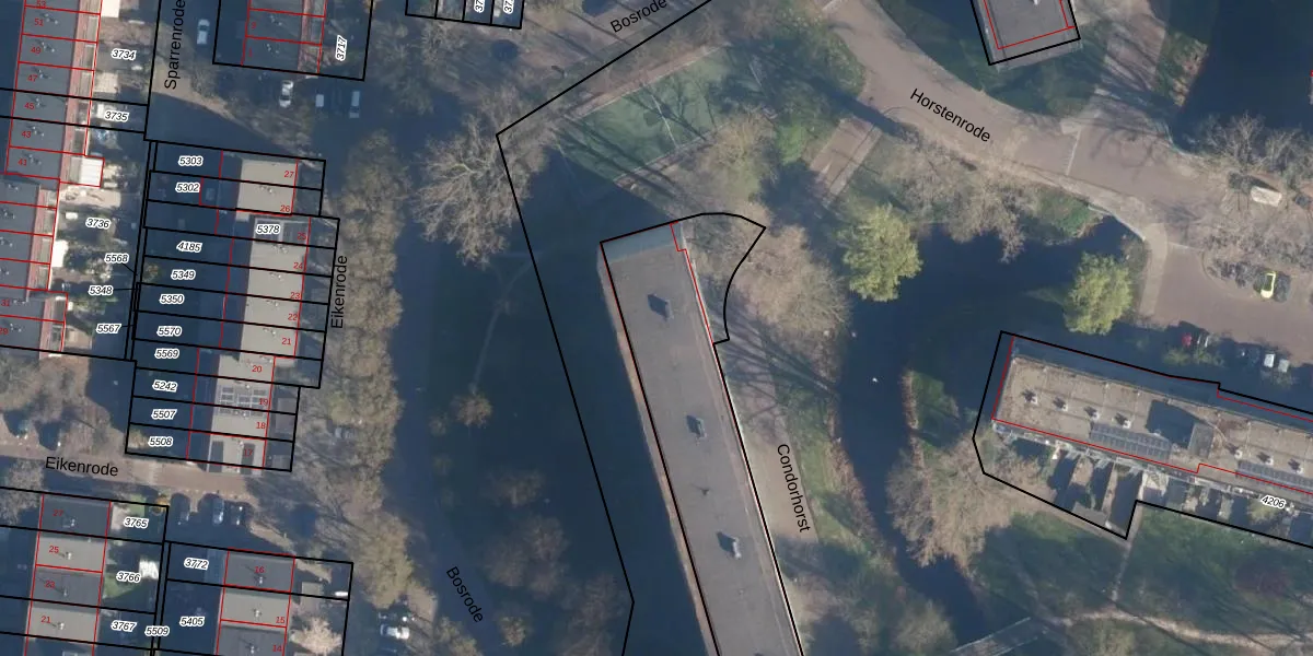 Het perceel waarop Condorhorst 165 staat heeft een oppervlakte van 3278 m². Dit is een zeer groot perceel. De perceeloppervlakte wordt geregistreerd door het Kadaster. Gedetailleerde informatie over de maten van dit perceel kunt u vinden in het rapport Kadastrale kaart met maatvoering van Condorhorst 165.