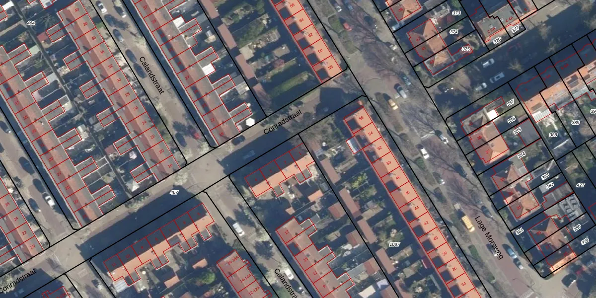 Het perceel waarop Conradstraat 1 staat heeft een oppervlakte van 2348 m². Dit is een zeer groot perceel. De perceeloppervlakte wordt geregistreerd door het Kadaster. Gedetailleerde informatie over de maten van dit perceel kunt u vinden in het rapport Kadastrale kaart met maatvoering van Conradstraat 1.