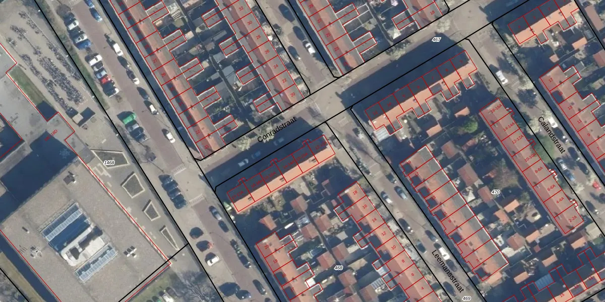 Conradstraat 13 is gelegen op kadastraal perceel LDN01R468. Deze kadastrale aanduiding is uniek en wordt gebruikt door het Kadaster om eigendomsrechten en andere zakelijke rechten vast te leggen. Het perceel maakt onderdeel uit van de kadastrale gemeente Leiden.