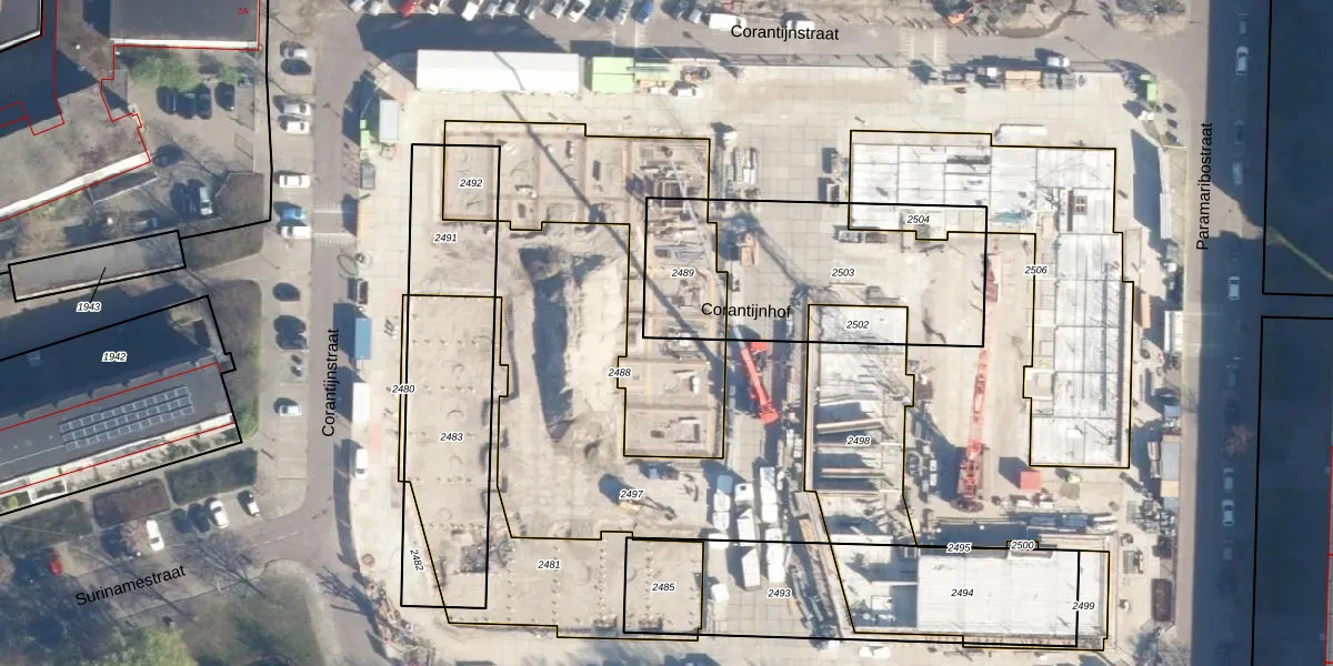 Het perceel waarop Corantijnhof 56 staat heeft een oppervlakte van 239 m². Dit is een middelgroot perceel. De perceeloppervlakte wordt geregistreerd door het Kadaster. Gedetailleerde informatie over de maten van dit perceel kunt u vinden in het rapport Kadastrale kaart met maatvoering van Corantijnhof 56.