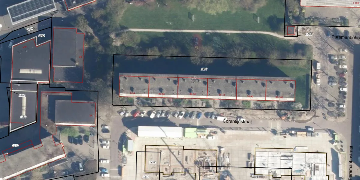 Het perceel waarop Corantijnstraat 42 staat heeft een oppervlakte van 3081 m². Dit is een zeer groot perceel. De perceeloppervlakte wordt geregistreerd door het Kadaster. Gedetailleerde informatie over de maten van dit perceel kunt u vinden in het rapport Kadastrale kaart met maatvoering van Corantijnstraat 42.