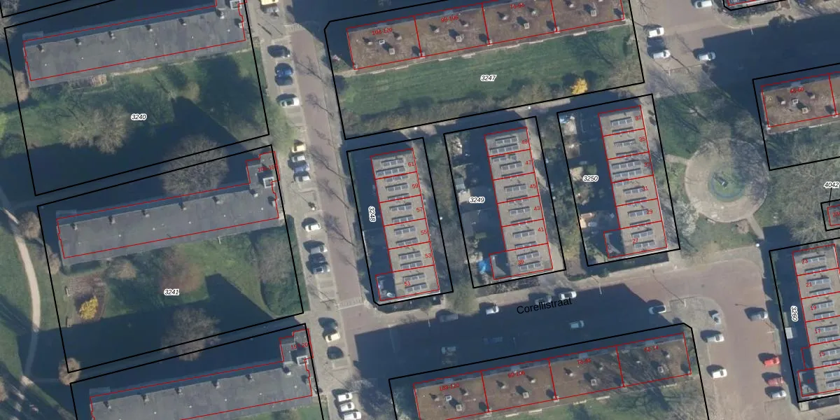 Corellistraat 57 is gelegen op kadastraal perceel LDN01O3248. Deze kadastrale aanduiding is uniek en wordt gebruikt door het Kadaster om eigendomsrechten en andere zakelijke rechten vast te leggen. Het perceel maakt onderdeel uit van de kadastrale gemeente Leiden.