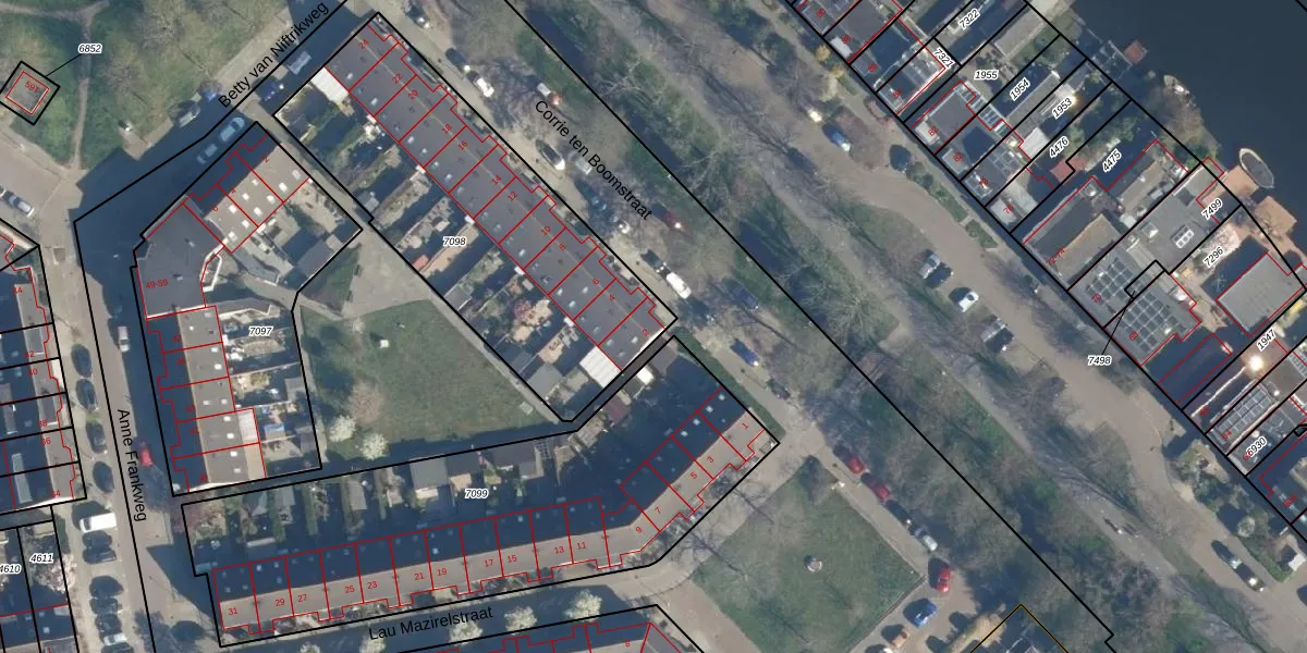 Corrie ten Boomstraat 2 is gelegen op kadastraal perceel LDN01W7098. Deze kadastrale aanduiding is uniek en wordt gebruikt door het Kadaster om eigendomsrechten en andere zakelijke rechten vast te leggen. Het perceel maakt onderdeel uit van de kadastrale gemeente Leiden.