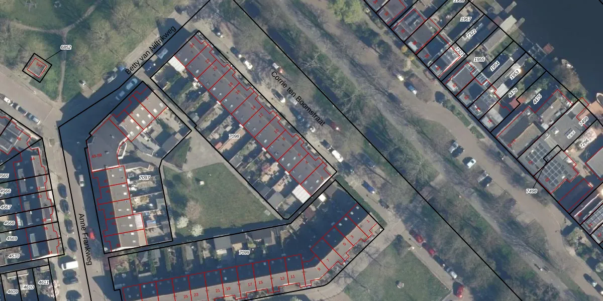 Corrie ten Boomstraat 6 is gelegen op kadastraal perceel LDN01W7098. Deze kadastrale aanduiding is uniek en wordt gebruikt door het Kadaster om eigendomsrechten en andere zakelijke rechten vast te leggen. Het perceel maakt onderdeel uit van de kadastrale gemeente Leiden.