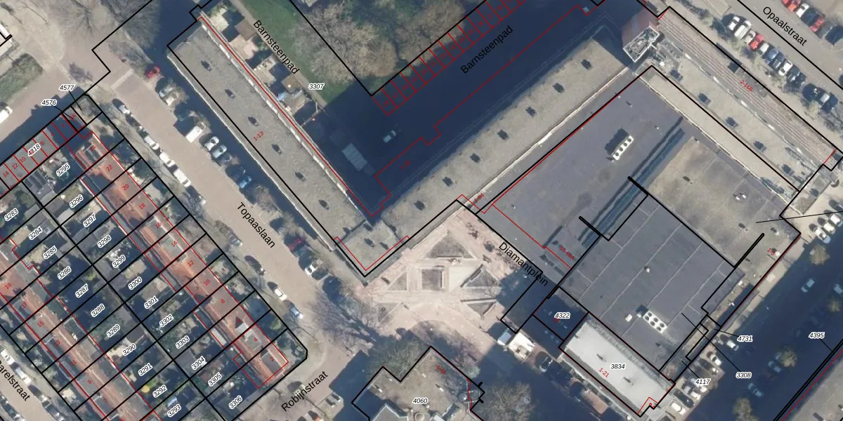 Het perceel waarop Diamantplein 29 staat heeft een oppervlakte van 4890 m². Dit is een zeer groot perceel. De perceeloppervlakte wordt geregistreerd door het Kadaster. Gedetailleerde informatie over de maten van dit perceel kunt u vinden in het rapport Kadastrale kaart met maatvoering van Diamantplein 29.
