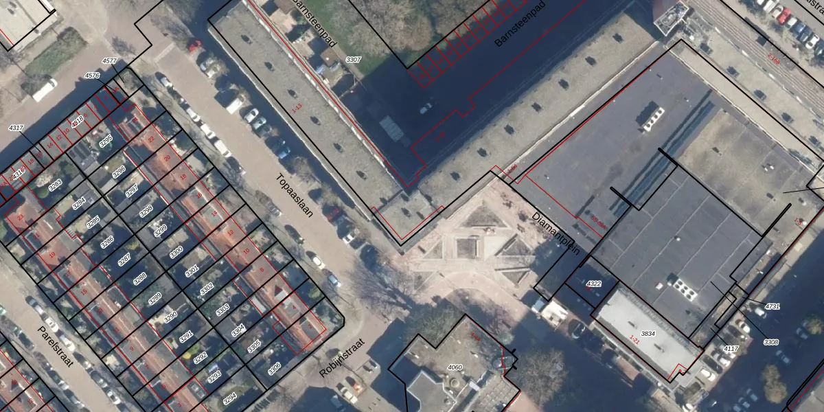 Het perceel waarop Diamantplein 32 staat heeft een oppervlakte van 4890 m². Dit is een zeer groot perceel. De perceeloppervlakte wordt geregistreerd door het Kadaster. Gedetailleerde informatie over de maten van dit perceel kunt u vinden in het rapport Kadastrale kaart met maatvoering van Diamantplein 32.