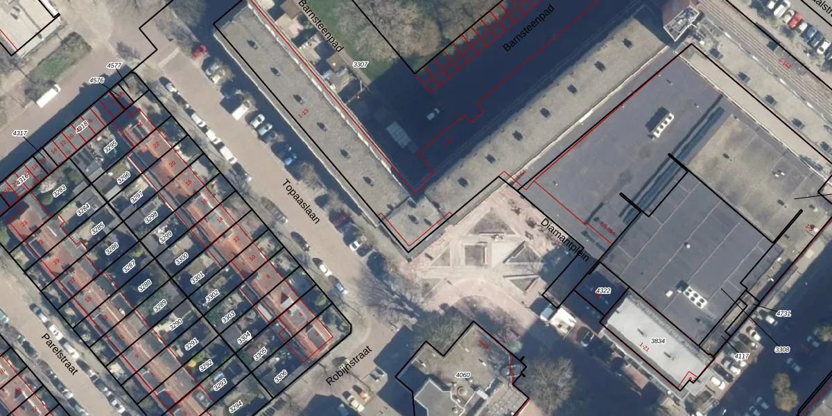 Het perceel waarop Diamantplein 52 staat heeft een oppervlakte van 4890 m². Dit is een zeer groot perceel. De perceeloppervlakte wordt geregistreerd door het Kadaster. Gedetailleerde informatie over de maten van dit perceel kunt u vinden in het rapport Kadastrale kaart met maatvoering van Diamantplein 52.