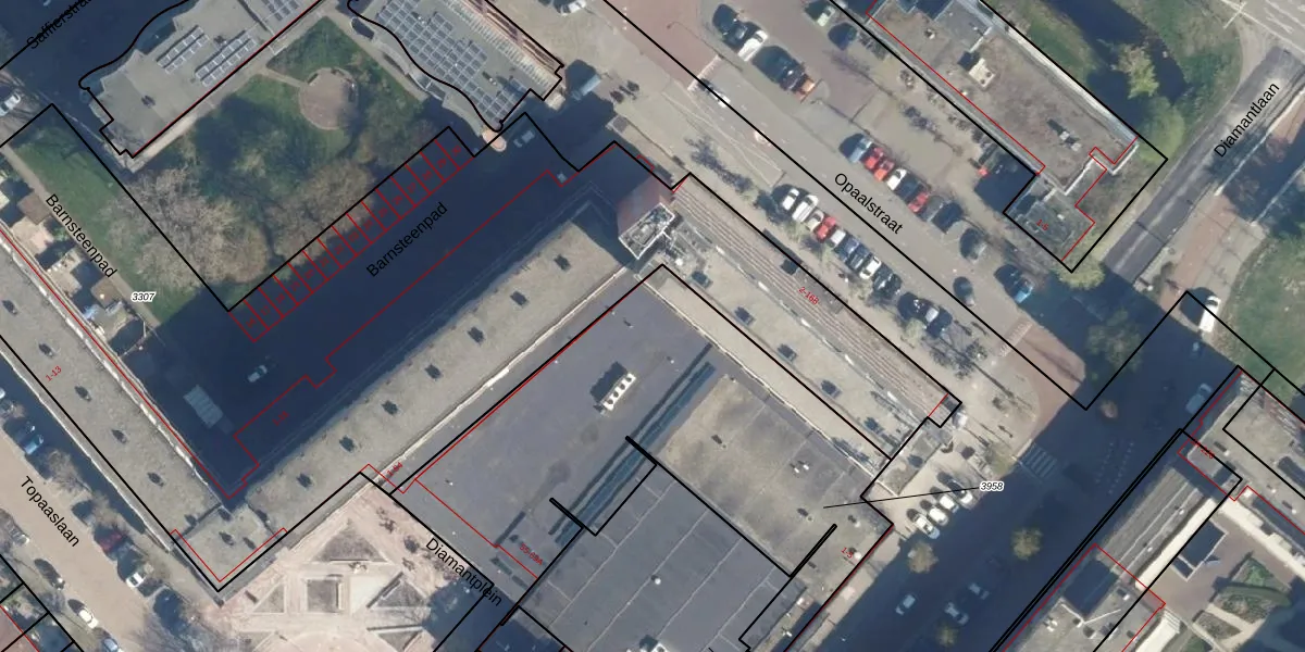 Het perceel waarop Diamantplein 62 staat heeft een oppervlakte van 2125 m². Dit is een zeer groot perceel. De perceeloppervlakte wordt geregistreerd door het Kadaster. Gedetailleerde informatie over de maten van dit perceel kunt u vinden in het rapport Kadastrale kaart met maatvoering van Diamantplein 62.