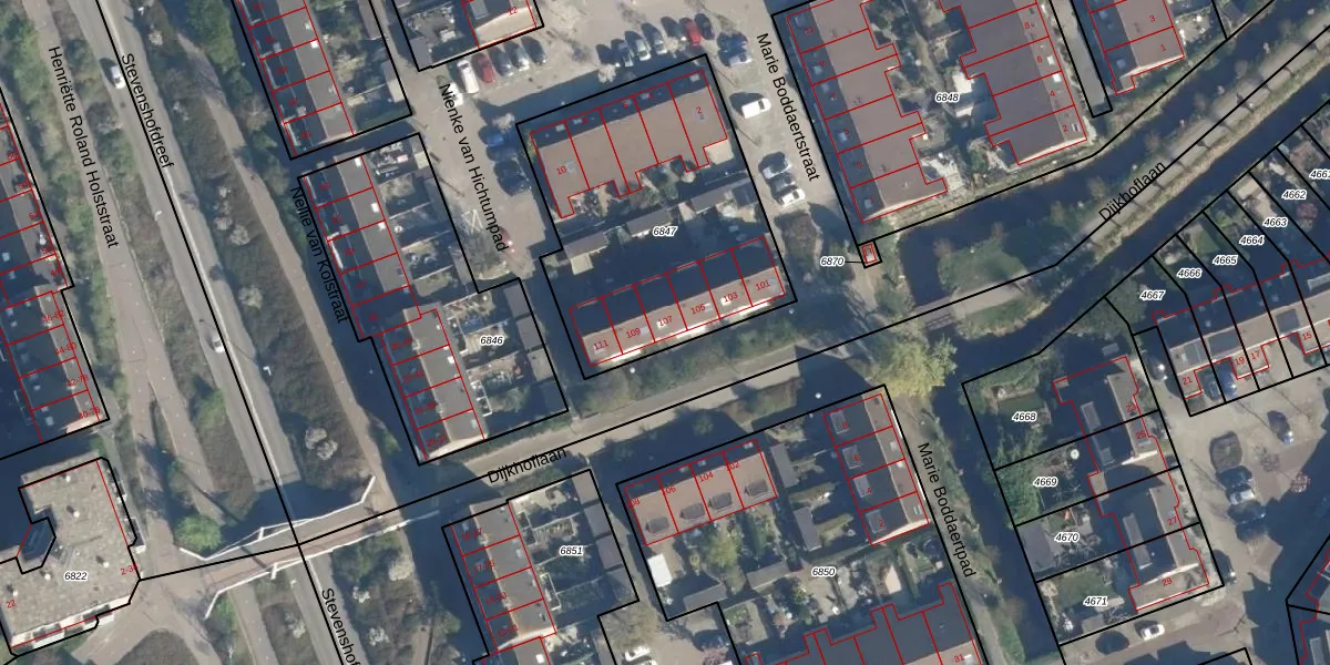 Dijkhoflaan 107 is gelegen op kadastraal perceel LDN01W6847. Deze kadastrale aanduiding is uniek en wordt gebruikt door het Kadaster om eigendomsrechten en andere zakelijke rechten vast te leggen. Het perceel maakt onderdeel uit van de kadastrale gemeente Leiden.