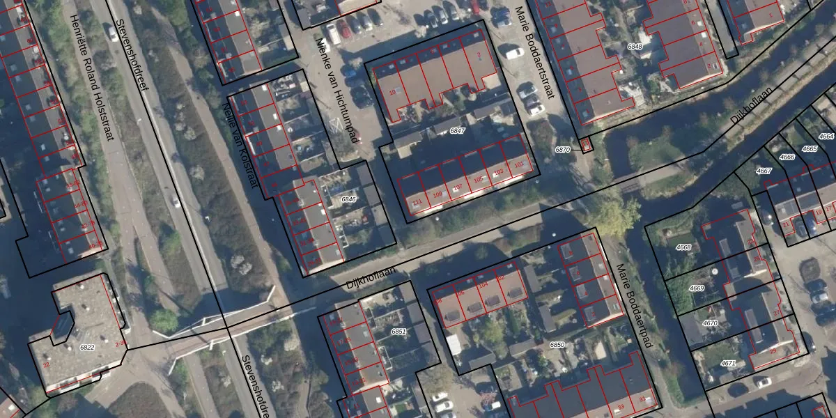 Dijkhoflaan 111 is gelegen op kadastraal perceel LDN01W6847. Deze kadastrale aanduiding is uniek en wordt gebruikt door het Kadaster om eigendomsrechten en andere zakelijke rechten vast te leggen. Het perceel maakt onderdeel uit van de kadastrale gemeente Leiden.