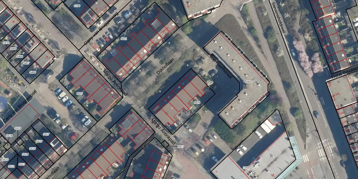 Dijkhoflaan 114 is gelegen op kadastraal perceel LDN01W6829. Deze kadastrale aanduiding is uniek en wordt gebruikt door het Kadaster om eigendomsrechten en andere zakelijke rechten vast te leggen. Het perceel maakt onderdeel uit van de kadastrale gemeente Leiden.