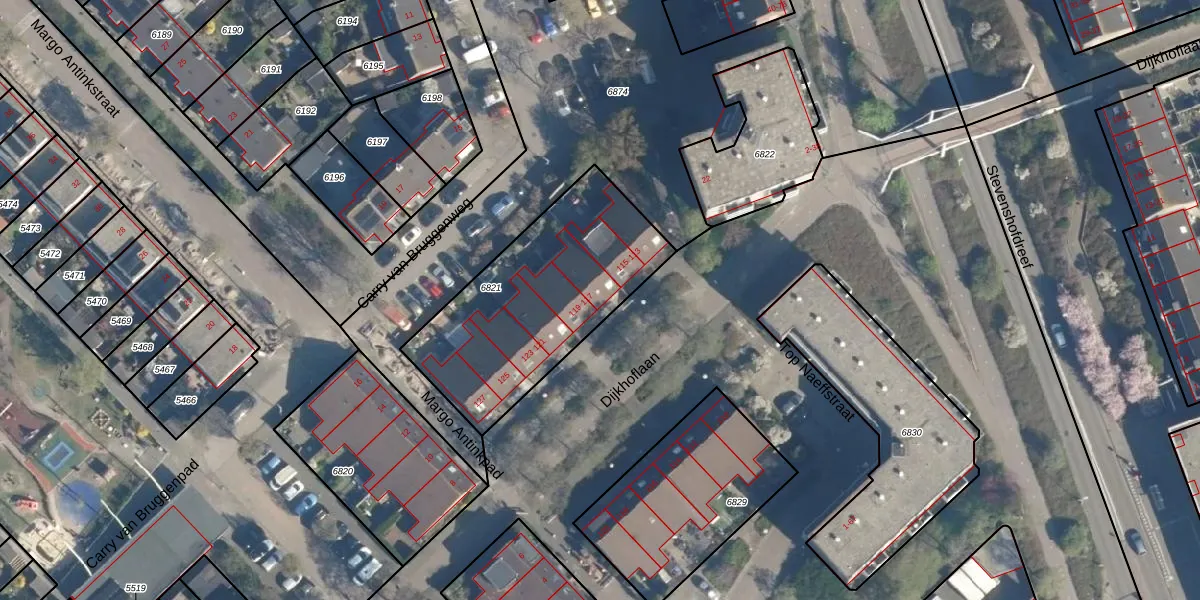 Dijkhoflaan 117 is gelegen op kadastraal perceel LDN01W6821. Deze kadastrale aanduiding is uniek en wordt gebruikt door het Kadaster om eigendomsrechten en andere zakelijke rechten vast te leggen. Het perceel maakt onderdeel uit van de kadastrale gemeente Leiden.