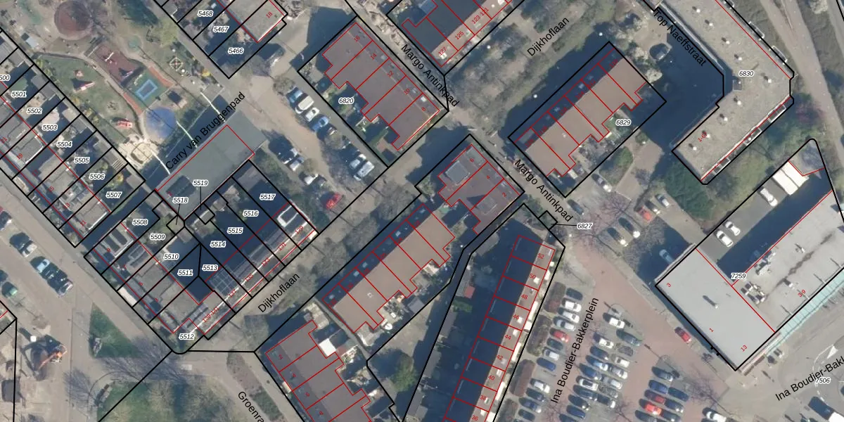 Het perceel waarop Dijkhoflaan 122 staat heeft een oppervlakte van 3470 m². Dit is een zeer groot perceel. De perceeloppervlakte wordt geregistreerd door het Kadaster. Gedetailleerde informatie over de maten van dit perceel kunt u vinden in het rapport Kadastrale kaart met maatvoering van Dijkhoflaan 122.
