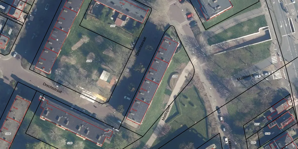 Drechtstraat 109 is gelegen op kadastraal perceel LDN01Q1239. Deze kadastrale aanduiding is uniek en wordt gebruikt door het Kadaster om eigendomsrechten en andere zakelijke rechten vast te leggen. Het perceel maakt onderdeel uit van de kadastrale gemeente Leiden.