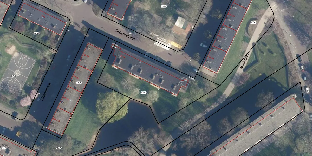Het perceel waarop Drechtstraat 63 staat heeft een oppervlakte van 1880 m². Dit is een zeer groot perceel. De perceeloppervlakte wordt geregistreerd door het Kadaster. Gedetailleerde informatie over de maten van dit perceel kunt u vinden in het rapport Kadastrale kaart met maatvoering van Drechtstraat 63.